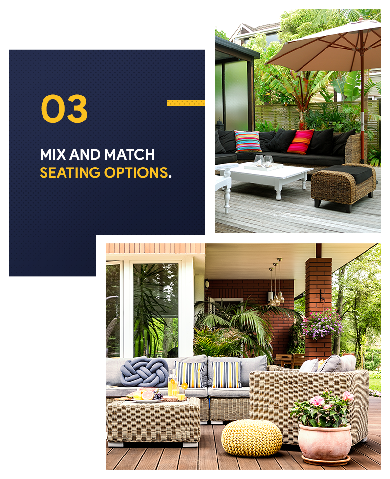 According to Zillow's 2019 Outdoor Living Trends, there's no need to rely on matching patio sets to upgrade your space. Instead, you can mix and match your seating options to achieve that curated, eclectic look that continues to gain popularity. Pull together benches, chairs, pint-sized stools, and ottoman for a unique look. You can even add floor pillows and poufs to create extra seating in your lounge area because, who doesn’t love that lovely Bohemian feel?